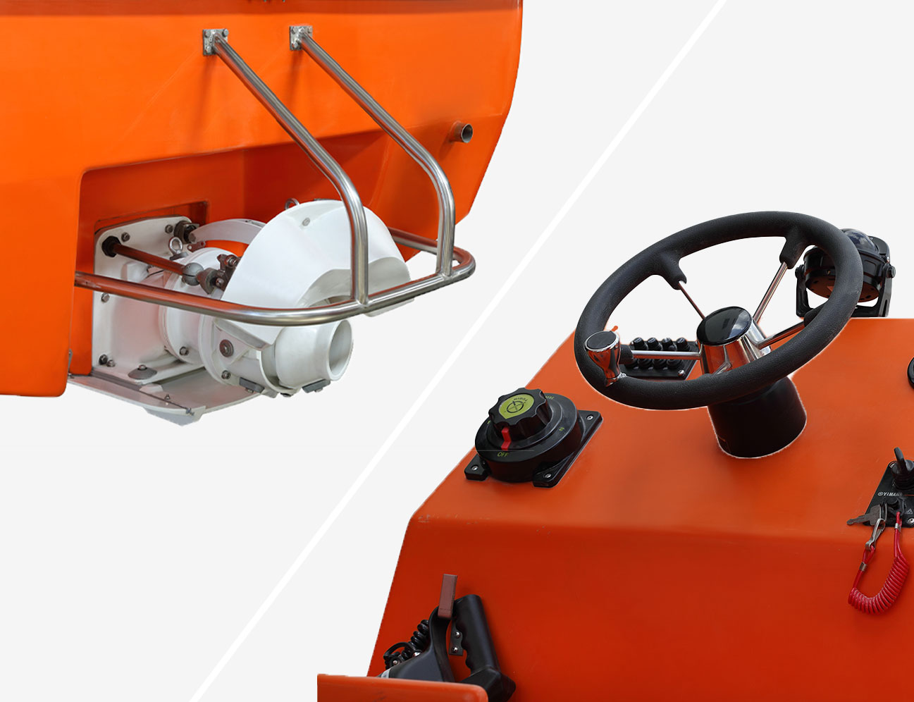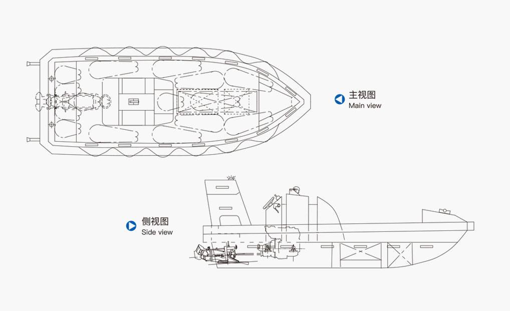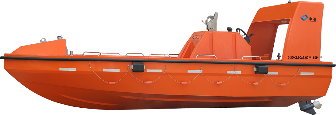 This boat has been designed, built and tested in full compliance with the requirements of Part 1 of MSC.81(70) Revised Recommendation on Testing of Life-saving Appliance as amended by MSC.226(82), MSC.274(85), MSC.321(89)and MSC.323(89), Regulations 21, 31 and 34, Chapter Ⅲ of International Convention for the Safety of Life at Sea, 1974, as Amended., and Chapter V of MSC.48(66) International Lifesaving Appliance Code, as amended by MSC.218(82), MSC.272(85) and MSC.320(89). The hull is made of fire-retardant FRP, the surfaces for personnel to walk on are non-slip, and the inner shell and hull are filled with polyurethane foam to provide sufficient buoyancy for the boat. If there is damage to the hull below the waterline, the floating part will still provide enough buoyancy to keep the entire boat afloat on a safe level. The rescue boat is equipped with steel handrails on both sides to facilitate the boarding and alighting of the crew, a self heaving deck to ensure the rapid discharge of flushed-in sea water, a hand pump for removing stagnant water from the boat, a stainless steel hook system - which can be lowered or recovered by means of a davit rope, a self-supporting air tank to satisfy the requirements of passenger and cargo RO-RO vessels. The boat can sail at full speed with a full load for more than 4 hours and can reach a speed of more than 20 knots with a crew of 3 people and more than 8 knots with a full load.